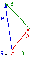 Consider two vectors A and B which we want to add. They might be displacement vectors or velocity vectors or electric field vectors -- or any vectors at all. We can add them graphically by drawing vector A and then, at the tip of vector A, drawing vector B as shown below. The sum of vectors is called the resultant. The resultant vector R, is the vector that we can draw from the beginning of A to the end of B. We can write this as