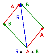Sometime people will draw the vectors in twice to form a parallelogram as shown below. The resultant R is the diagonal as shown. This is referred to as vector addition by the parallelogram method.