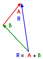 Consider two vectors A and B which we want to add. They might be displacement vectors or velocity vectors or electric field vectors -- or any vectors at all. We can add them graphically by drawing vector A and then, at the tip of vector A, drawing vector B as shown below. The sum of vectors is called the resultant. The resultant vector R, is the vector that we can draw from the beginning of A to the end of B. We can write this as