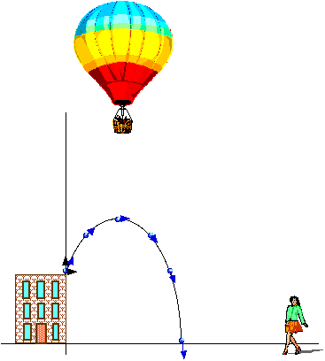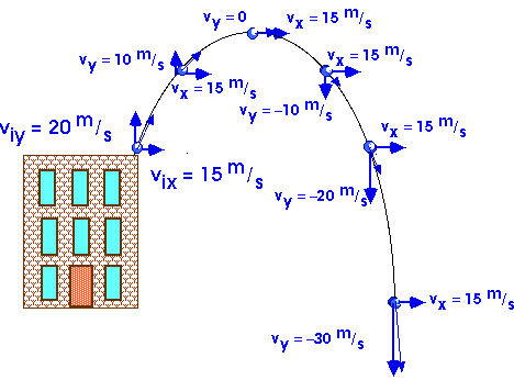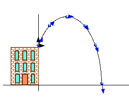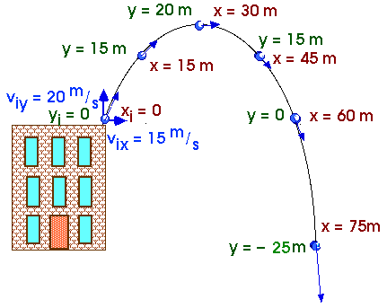 ExampleTo make the arithmetic easy, let's use the approximation that g = 10 m/s2 and throw a ball from the top of the Science Building and look at its velocity and position.