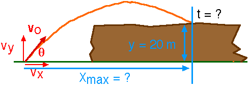 A rock is thrown with an initial speed of 30 m/s at an angle of 60o above the horizontal. As shown in the sketch, it is thrown from a canyon floor and goes up into the air and then lands on the plateau, 20 m above the canyon floor. Where does it hit the ground? Or, how far does it travel horizontally?