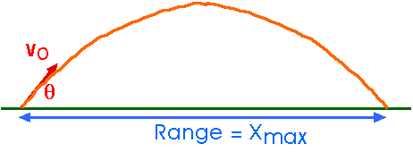 x = vx t Range = Xmax = x(ttot) = vxo ttot = (vo cos