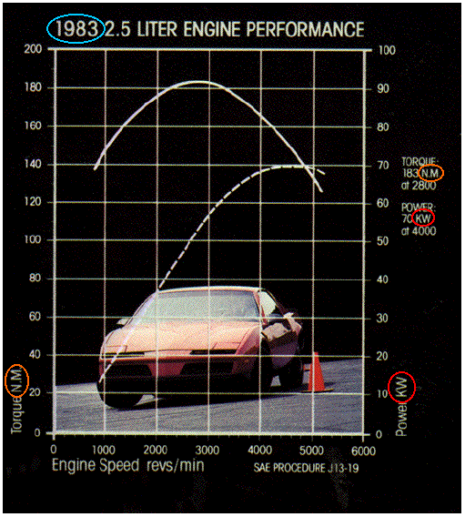 Like the engineers in other multi-national companies, GM's engineers recorded data in SI units. Power is measured in kilowatts (kW) and torque -- the rotational effect of a force -- is measured in newton-meters (NM or N-m). This is not something new; remember these graphics are from a 1983 Pontiac brochure!