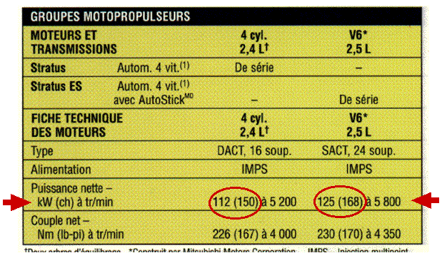 Here are excerpts from Francophone Canadian automobile brochures that do, indeed, show the engine power in kilowatts (kW) and in horsepower ("ch" for chavox in French).