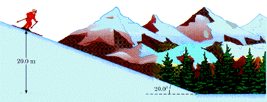 A skier starts from rest at the top of a frictionless incline of heigh 20 m as shown here. At the bottom of the incline, the skier encounters a horizontal surface where the coefficient of kinetic friction between the skis and snow is 0.210. How far does the skier travel on the horizontal surface before coming to rest?