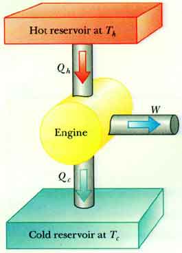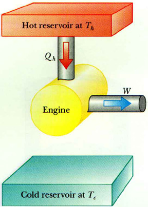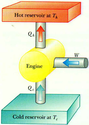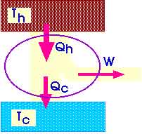 Consider a heat engine that takes some "working substance" -- typically a gas -- through a cyclic process. Thermal energy Qh is absorbed from a source at a hot temperature Th. Net work W is done by the heat engine on its surroundings. Thermal energy Qc is given to a source at a cold temperature Tc.