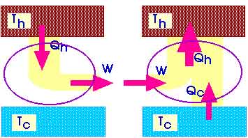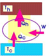 A heat pump or a refrigerator is a device that absorbs heat Qc from a cold temperature and releases heat Qh at a hot temperature because work W is done to it from the outside. We could make a diagram of such a refrigerator or heat pump as