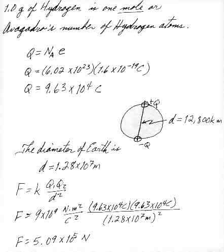23.5 Suppose that 1.00 g of hydrogen is separated into electrons and protons. Suppose also that the protons are placed at Earths North Pole and the electrons are placed at the South Pole. What is the resulting compressional force on Earth?