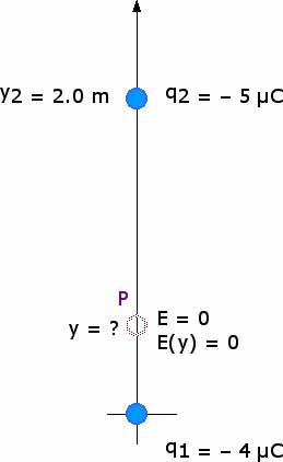 23.***. A charge of - 4.0 microCoulombs is located at the origin and a charge of - 5.0 microCoulombs is located along the y-axis at y = 2.0 m. At what point along the y-axis is the electric field zero?