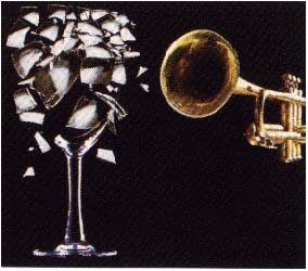 Here is another interesting example of resonance. Just as the vibration of air at the right frequency causes the chime to oscillate or ring, vibration of air at the right frequency will cause a glass to oscillate or ring. If this oscillation can be made great enough, the oscillating glass will break.