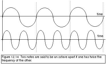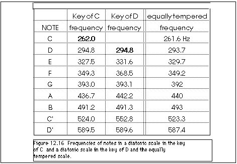 To avoid all the labor and tedium in this retuning, the scheme of an equally tempered scale has been devised. Including the black keys-the sharps and flats-on a piano keyboard, there are twelve notes, called half-steps, between C and C'. We require that the frequency of C' be twice that of C and that the ratio of the frequencies of neighboring half-step notes or keys be the same. That means the ratio of frequencies of neighboring keys must be the twelfth root of 2, (that is, (1.05946)12 = 2). That is, if the frequency of each key is 1.06 times the frequency of the neighboring key, by the time you move from middle C, through twelve keys, and arrive at C' an octave higher, the frequency of C' will be exactly 2 times the frequency of middle C. Figure 12.16 also lists the frequencies of the notes of this equally tempered scale. This is a compromise so that notes and chords of all keys sound equally good (or bad) when played on this scale.