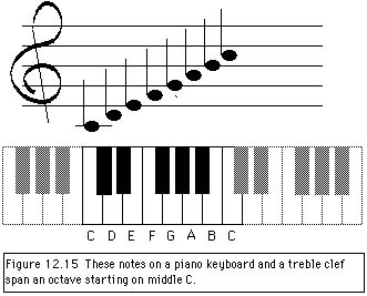 Figure 12.15 shows the notes on a piano keyboard and a treble