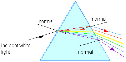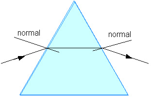 A prism changes the direction of light as shown in Figure 17.2. Light enters the prism going from air to glass so it is bent toward the normal at this first surface. It travels through the glass and then goes from glass to air. At that second surface it is bent away from the normal. Since the two surfaces are not parallel, the final direction of the exiting light is different than the initial direction of the incoming light. The bending or refraction at each surface depends upon the angle of incidence there and the index of refraction of the glass.