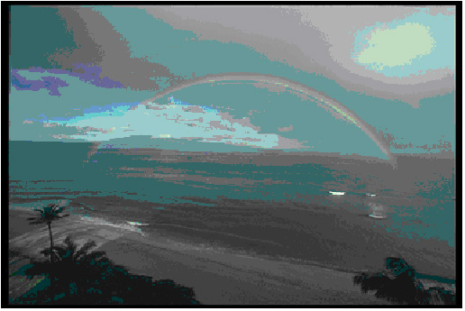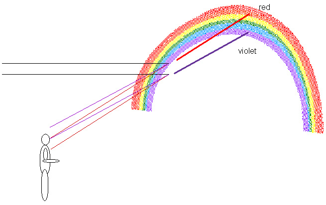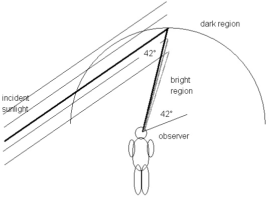 Figure 17.8 shows what an observer would see with the Sun over her back and sunlight incident on a mist of tiny water droplets. Most of the light will be scattered through about 138o, with an angle of 42o between the incoming and scattered light. This will produce a bright arc or ring or "bow" with an angle of 42o between the center of this bow and the bow as measured by the observer as sketched in the figure. Some light will be scattered through angles greater than 138o so this light will be seen inside the bow, making this region brighter. No light will be scattered through angles smaller than 138o so no light will be scattered outside the bow, making this region dark.
