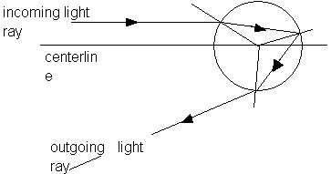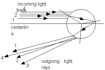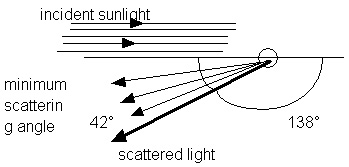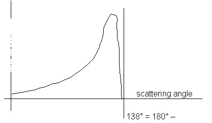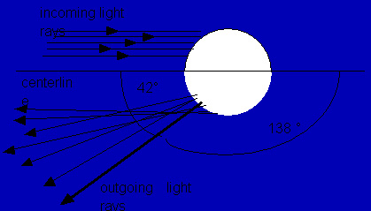 If we look at light rays that come into a spherical water droplet at varying distances from the centerline, we will find that some of the rays are scattered through 180o,entirely back scattered. Other rays will be scattered less but there is a minimum scattering angle of about 138o as shown in Figures 17.5 and 17.6. That means the angle between the incident light and the scattered light will be 42o (42o = 180o - 138o). In fact, most of the light will be scattered at an angle very close to this as shown in Figure 17.7.