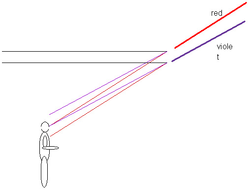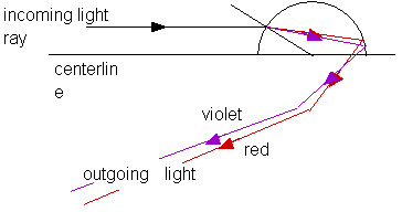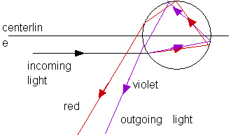 This description is the beginning of explaining a rainbow but no mention has yet been made concerning colors. You will recall that the index of refraction depends upon the color or wavelength of light; this is known as dispersion. This is easy to see when light passes through a prism. The same thing happens when white sunlight, which contains all wavelengths or colors of light, passes through a water droplet. As sketched in Figure 17.9, violet light will be scattered through a greater angle than red light. Violet and red are the extremes of the visible range. We will concentrate our attention on these extremes, knowing that all the other colors will be found at angles between violet and red.