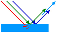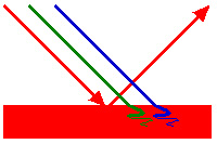 We see the color of an object by the light that it reflects. When white light, such as sunlight, shines on an object that means it is illuminated with light of all wavelengths. If red light is reflected while light of other colors is absorbed, we will see the object as red as shown in Figure 17.17. There we have used incoming rays of red, green, and blue to indicate the full range of colors that is in white light. Objects that we see having different colors reflect different colors from white light and absorb the rest; this is illustrated in Figure 17.18 for a green object and a blue object.