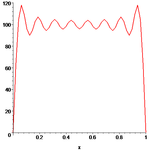 Here we consider a uniform rod of length 1 with constant thermal properties. Both ends are iced, k = 1/10, and the rod is initially heated to 100 degrees. Below we animate the temperature distribution for 6 seconds. Only the first 15 terms in the infinite series solution to the Heat Equation are used.