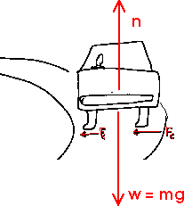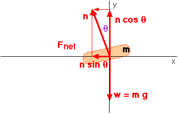 Banked CurvesHow can a car ever travel at all on a slippery highway? Some curves are banked to compensate for slippery conditions like ice on a highway or oil on a racetrack. Below is a car making a banked turn. Without friction, the roadway still exerts a normal force n perpendicular to its surface. And the downward force of the weight w is present. Those two forces add as vectors to provide a resultant or net force Fnet which points toward the center of the circle; this is the centripetal force. Note that it points to the center of the circle; it is not parallel to the banked roadway.
