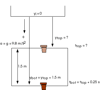From the floor of the canyon, from being at rest, Wyl E Coyote accelerates upward with an acceleration of 8.18 m/s2. We could start everything over at this point and measure distances from the floor of the canyon. However, it is just as good -- and just as easy -- to leave the origin where it was and continue to measure distances from the top of the cliff. With that reference frame, the initial position for this part of the trip is