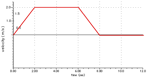 For the rest of the time, 8.0 s < t < 12.0 s, the acceleration is again zero so the velocity remains constant. During the two seconds from t = 6.0 s to 8.0 s, the velocity has been reduced from 2.0 m/s back to 0.0 so the object is at rest at 8.0 s. It remains at rest for the rest of the time.