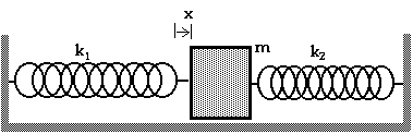 With this arrangement, a displacement of x causes a force of F1 = - k 1 x due to the spring on the left and a force of F2 = - k 2 x due to the spring on the right.![]()