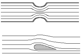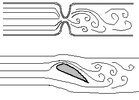 Turbulent flow is illustrated below -- flow through a small constriction in a pipe and flow around an airplane wing which is inclined at a steep angle. In turbulent flow, the motion of a particle after it passes a particular point may be quite different from the motion of the particle that preceded it at that point. Turbulent flow is characterized by randomness or irreproducibility of the motion of individual particles. It usually occurs in fluids moving at high speeds. As you might expect, friction is far greater in turbulent flow. We will concentrate most of our attention on streamline flow.