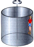 spins about its axis fast enough that any person inside is held up against the