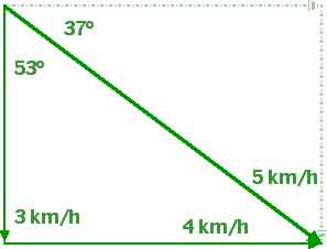 Of course this will requir another vector addition diagram. But this one is more fun. We want the resultant to be horizontal (or east). We know how fast the canoe can travel ( that's 4 km/h ) but we don't know the direction. At what direction do we need to paddel the canoe at 4 km/h so that when the river flows down (or south) at 3 km/h, the resultant velocity will be horizontal (or east)?