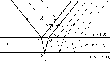 Light is reflected from the first surface of a thin film (at point A in this diagram). And some of the light is refracted and passes through the film and continues on to the second surface where it is again reflected (at point B in this diagram). This light passes through the film again and some of it is refracted (at point C in this diagram) and continues on with and interferes with the light originally reflected at the first surface.