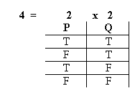 For example, let's extend the little translation table we used in the earlier examples, to add a second sentence. P: It's rainingWe can take these two little English-language subject-matter sentences to build an English-language conjunction: It's raining and it's cold.And we know that this conjunction will (following the little translation table) get translated like this: (PThis conjunction, like all conjunctions, is built up out of its two parts. So, we said, the truth value of the whole conjunction is going to depend on the truth-value of its two parts. Now, since we're starting with two basic sentences ("P" and "Q"), we know already (from Bivalence) that we'll need 4 valuations to go through all the possibilities.