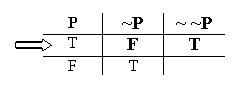 There's a technical name for these little vertical lists of truth values: each such list is called a truth table. So what we've done in the above example is build three truth tables: one truth table for "P", one for "~P", and one for "~ ~P". The second point also involves a new piece of logical jargon, but also an important new idea. If we look at the truth tables for "P" and "~ ~P", we notice that they're exactly the same.