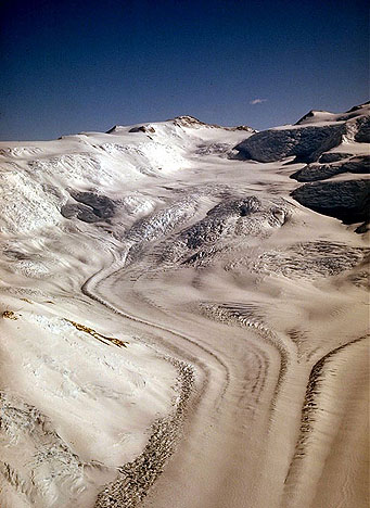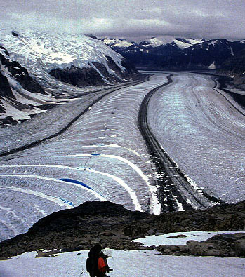 The beginnings of medial moraines (the dark bands) mark the junction