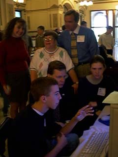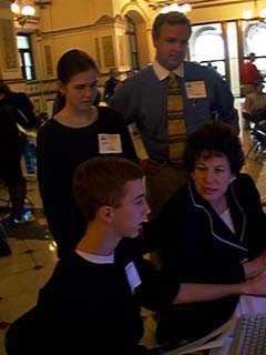 Andy and Emily demonstrate VRML 3-D modeling for Rep. Dale Righter and Sen. Judy Meyers.